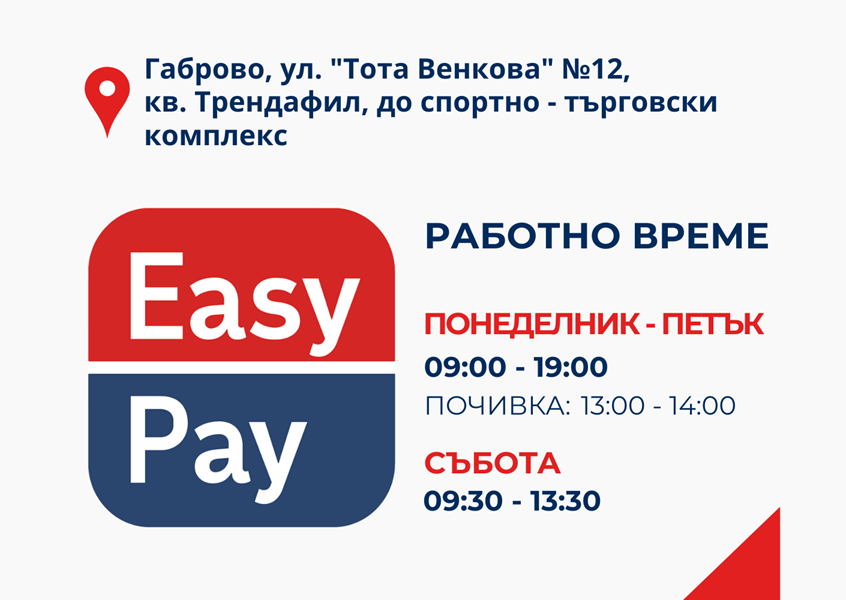 Нов офис на Изи Пей отвори врати в Габрово. Той се намира в квартал „Трендафила“, на ул. „Тота Венкова“ 12....