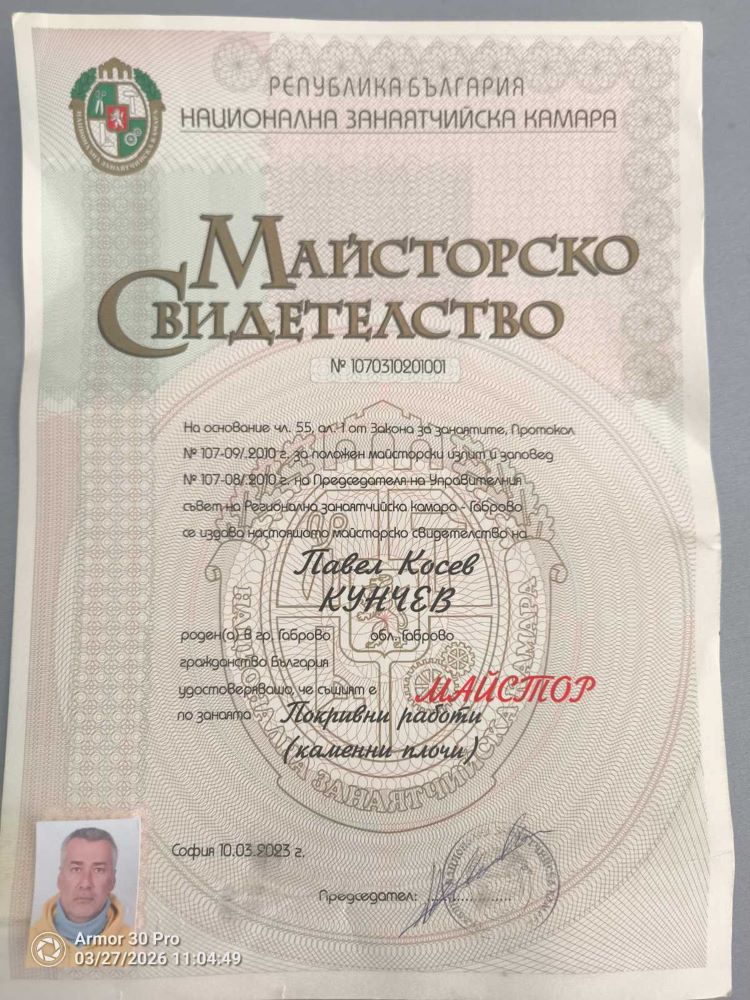 Павел Кунчев е сред малкото професионално подготвени специалисти в България за работа с камък. Той е и първият майстор в страната, получил свидетелство за „Покривни работи (каменни плочи)“ – признание за високото ниво на неговите умения и познания в традиционните строителни техники.