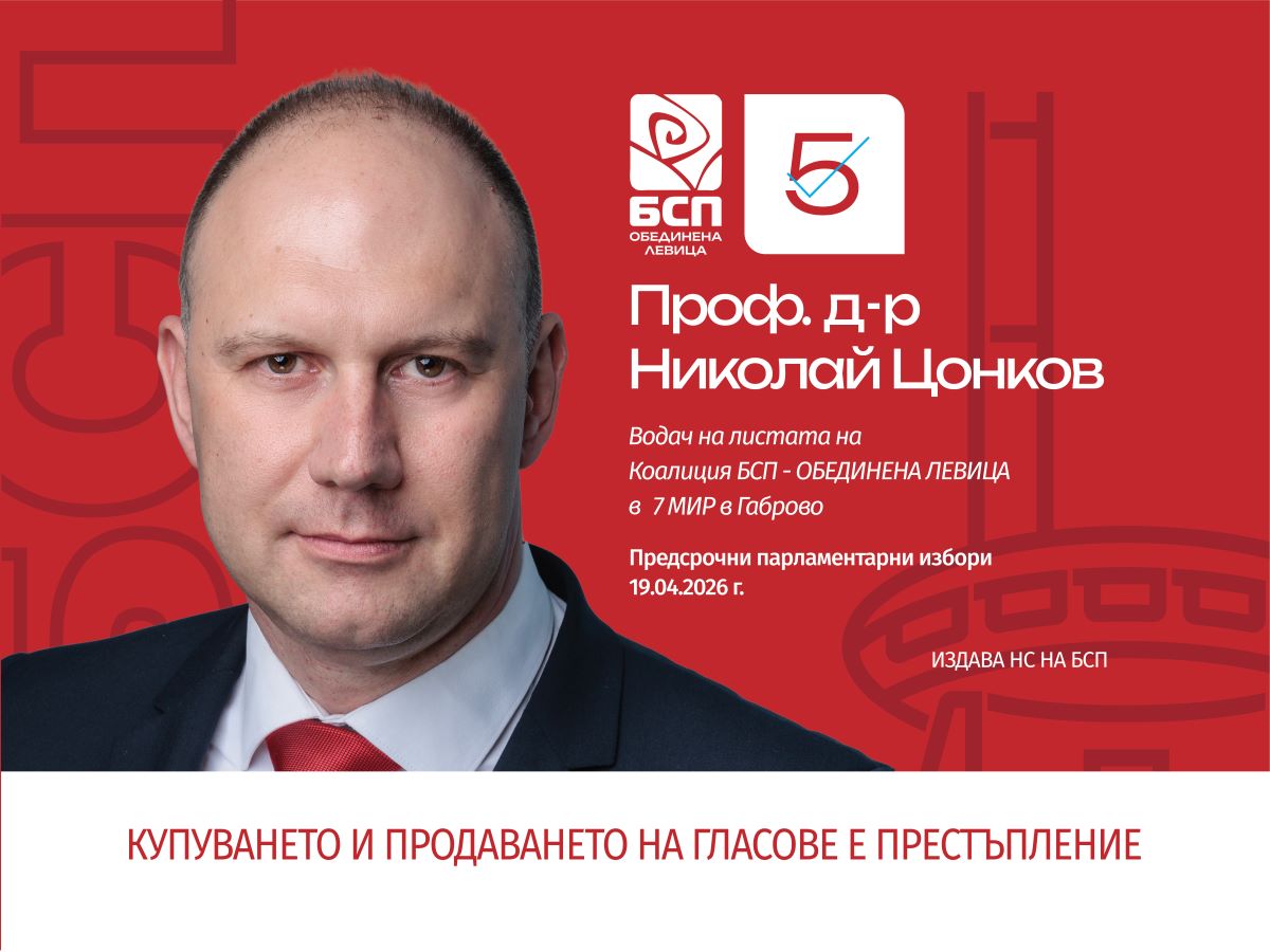 *Публикуваният материал е предоставен от пресцентъра на „БСП – Обединена левица“, във връзка с изборите за 52 Народно събрание, съгласно сключен договор за рекламно – информационно обслужване. „БСП – Обединена левица“ е под номер 5 в интегралната бюлетина. Купуването и продаването на гласове е престъпление.*