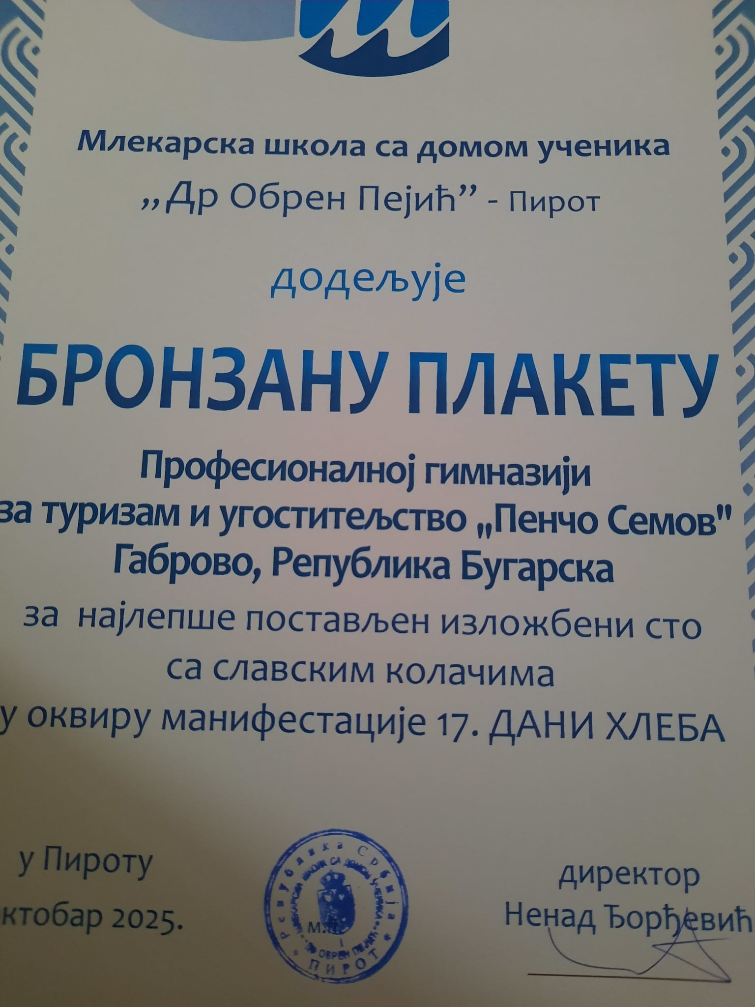 Ученици и учители представиха ПГТ „Пенчо Семов“ – Габрово в XII Международен панаир „Хляб и сирене“ в Пирот, Република Сърбия. Поканата на партньорското училище Млекарска школа „Д-р Обрен Пежич“ стана традиция, тъй като събитието се провежда ежегодно, с идеята за популяризиране на традиционни хлебни и млечни изделия от региона.