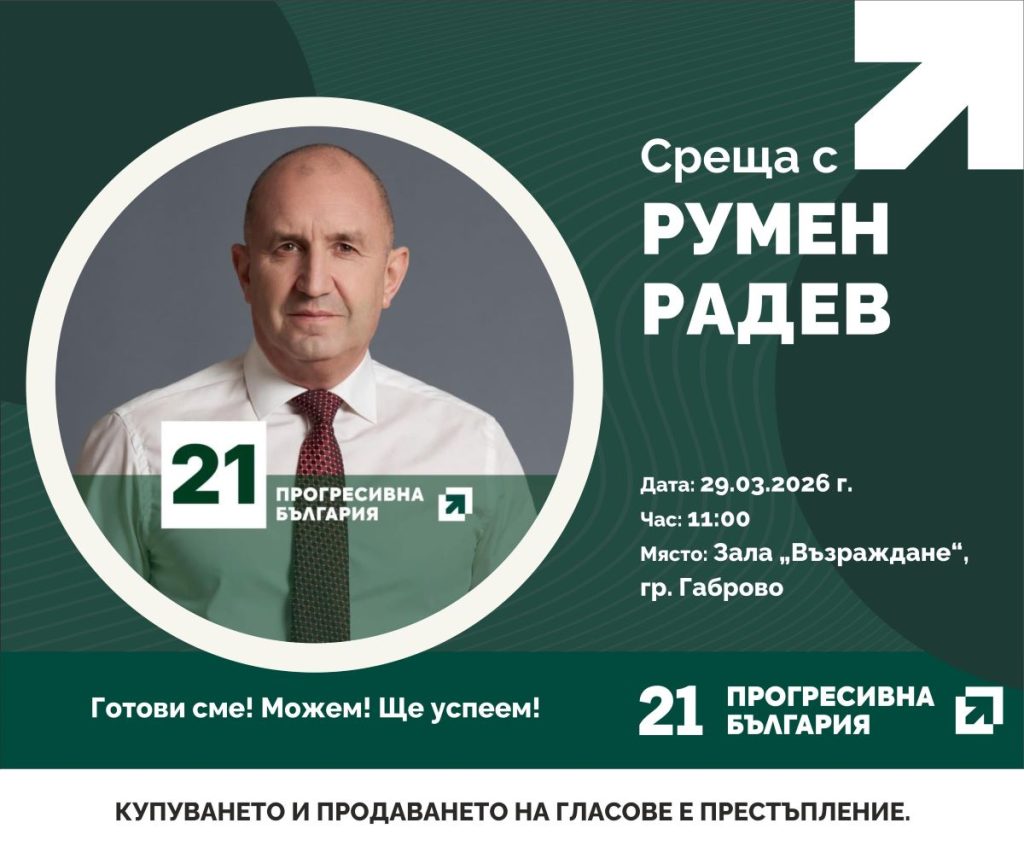Румен Радев, лидер на коалиция „Прогресивна България“, ще посети Габрово на 29 март (неделя). Срещата с гражданите ще се проведе от 11:00 ч. в зала „Възраждане“.