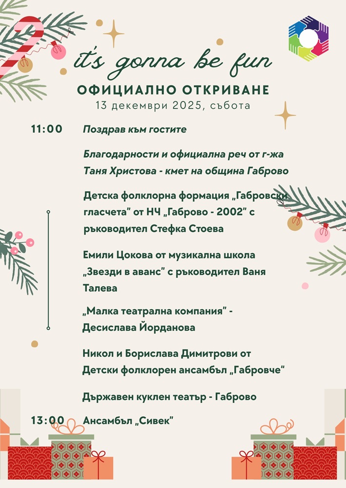 Официалното откриване ще бъде на 13 декември от 11.00 часа. Предвидена е празнична програма за малки и големи. Кметът на Габрово Таня Христова ще поздрави гостите и участниците в базара.