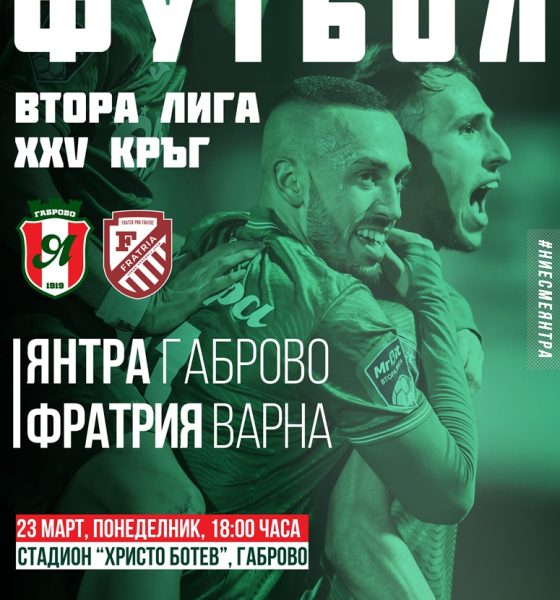 Дербито между четвъртия и втория във временното класиране ще затвори 24-ия кръг от първенството във Втора лига. Двубоят е днес, 23 март, на стадион „Христо Ботев“ и ще противопостави съставите на „Янтра“ и варненския „Фратрия“. Срещата започва в 18.00 часа и ще бъде предавана по „Диема спорт“.