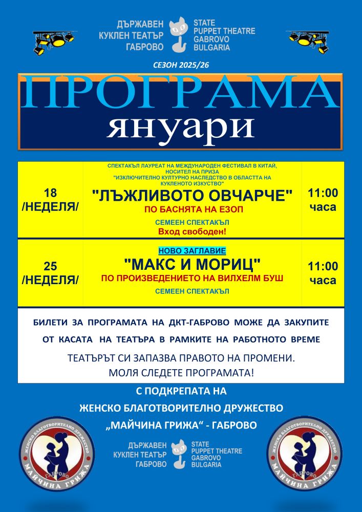 „Майчина грижа“ предоставя вход свободен за спектакъл с международно отличие в Държавен куклен театър – Габрово. Безвъзмездният жест на Женското благотворително дружество на Габрово насочен именно към най-малките любители на кукленото изкуство и техните близки има за цел в началото на годината да предостави искрица добро настроение със спектакъл лауреат на международен фестивал в Китай, носител на приза „Изключено културно наследство в областта на кукленото изкуство“, част от репертоара на ДКТ-Габрово.