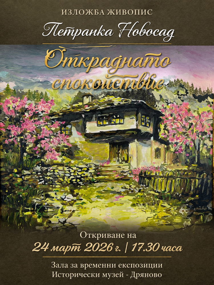 На 24 март, вторник, от 17.30 ч. залата за временни гостувания на Исторически музей – Дряново ще се превърне в пространство за съзерцание и красота с откриването на изложбата „Откраднато спокойствие“ на Петранка Новосад. Като дългогодишен приятел на музея, емблематичната за обществения живот на града авторка гостува в неговите зали за четвърти път, представяйки най-новите си творчески търсения.