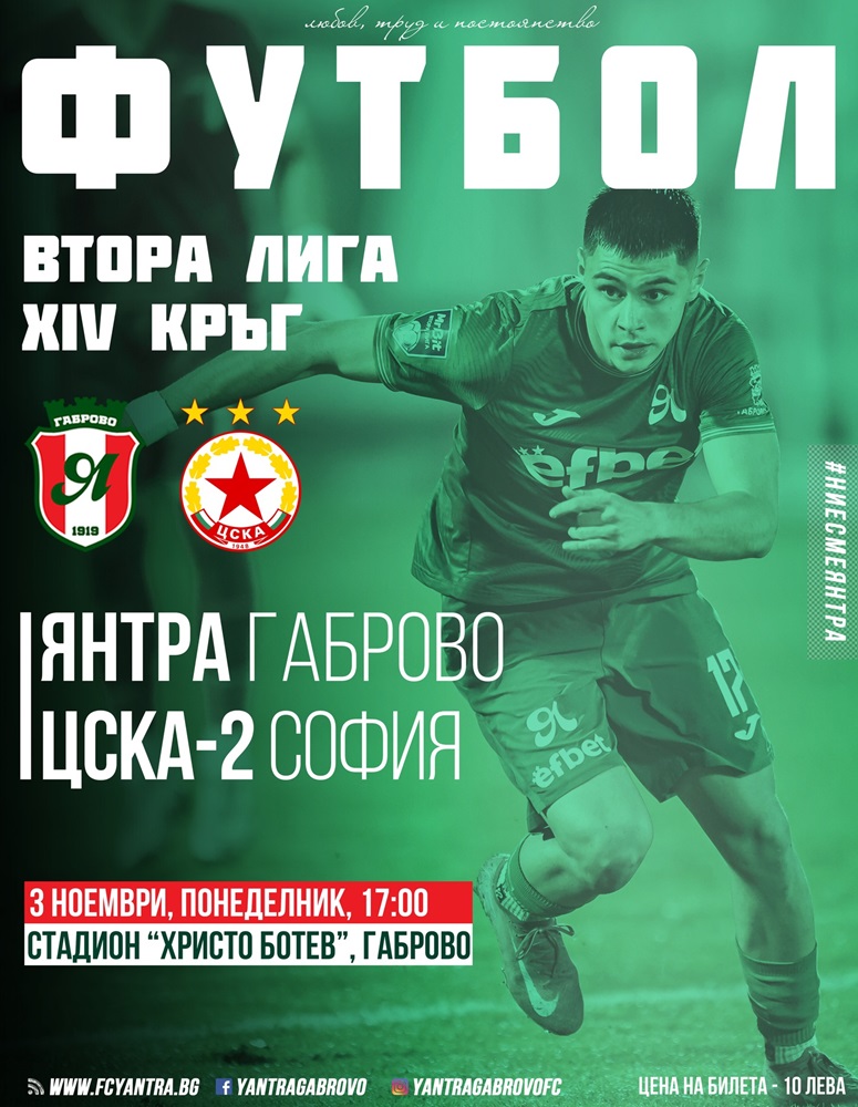 Двубой с труден съперник предстои на „Янтра“ в 14-я кръг на първенството във Втора лига. На стадион „Христо Ботев“ „ковачите“ ще приемат дублиращия тим на ЦСКА. Срещата е на осветление днес, понеделник, от 17.00 часа. Габровският тим ще се опита да запази статута си на непобеден в първенството от началото на сезона, но ще има срещу себе си сериозен опонент.